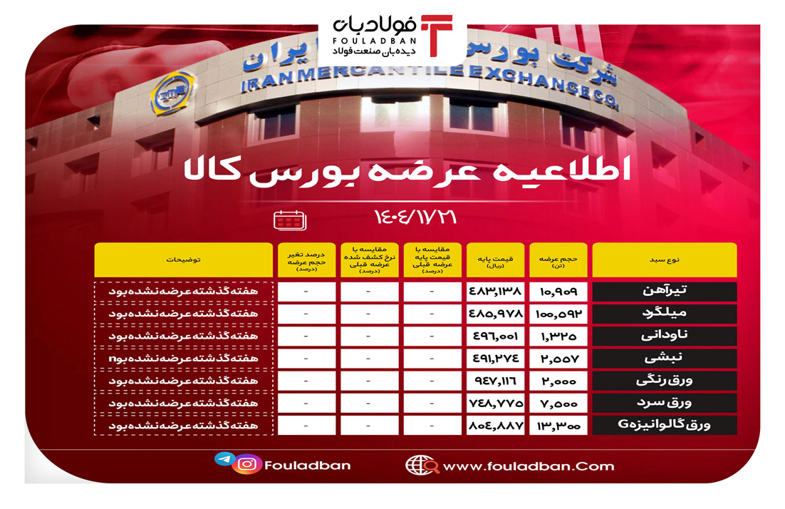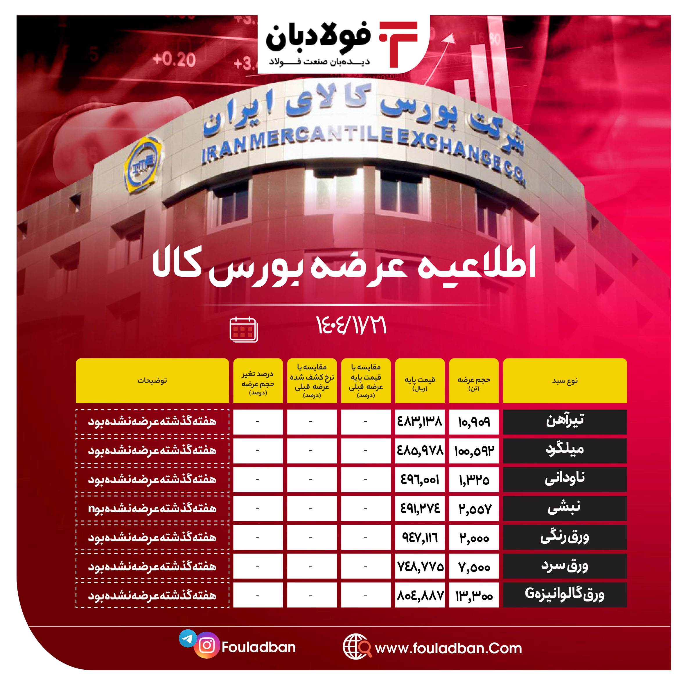 براساس اطلاعیه بورس کالا روز سه‌شنبه (۲۱ بهمن ۱۴۰۴) شاهد عرضه ۸ محصول فولادی هستیم.