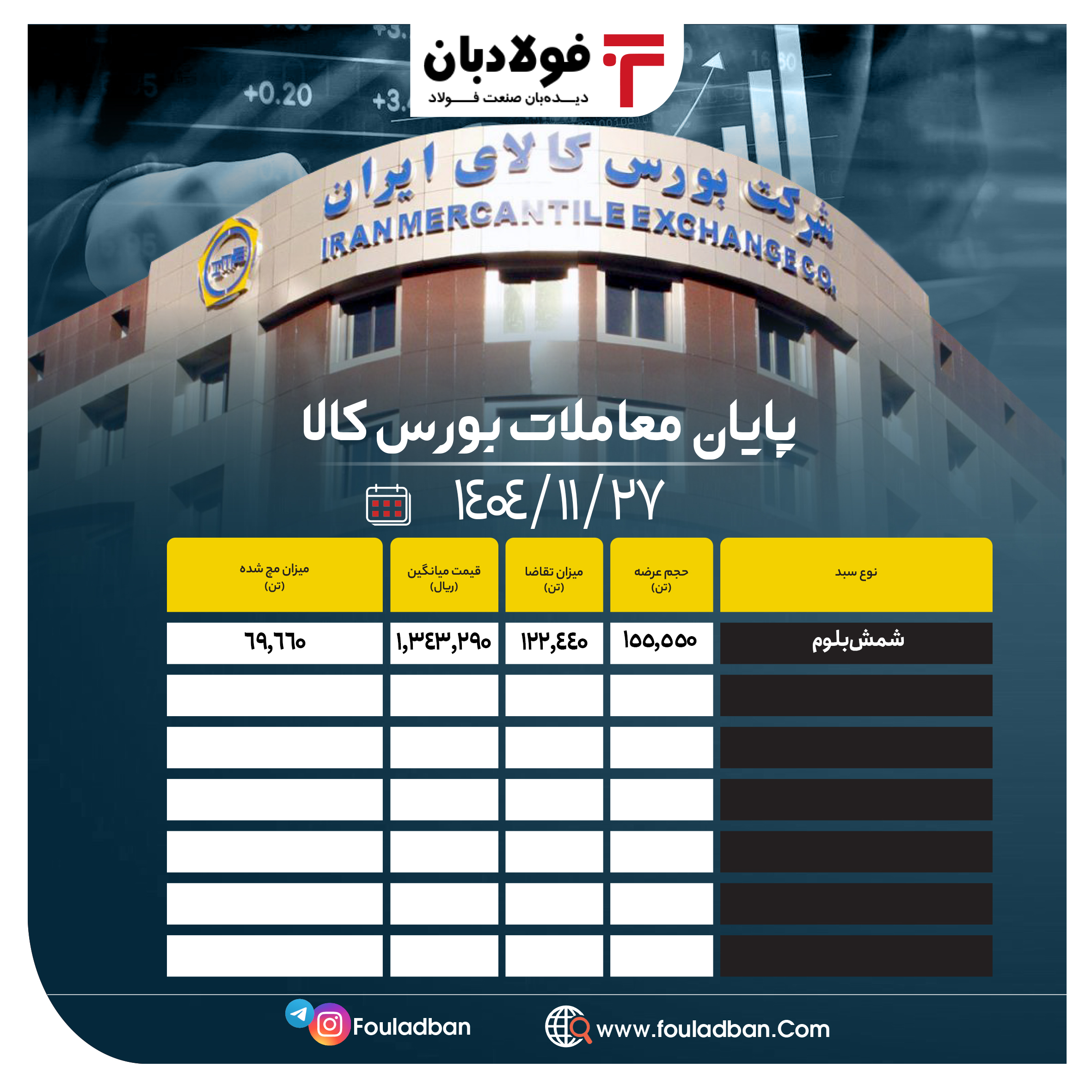 در معاملات امروز دوشنبه ۲۷ بهمن ۱۴۰۴، مجموعاً ۱۵۵ هزار و ۵۵۰ تن از این محصولات معدنی روی تابلوی معاملات بورس کالا عرضه شد.