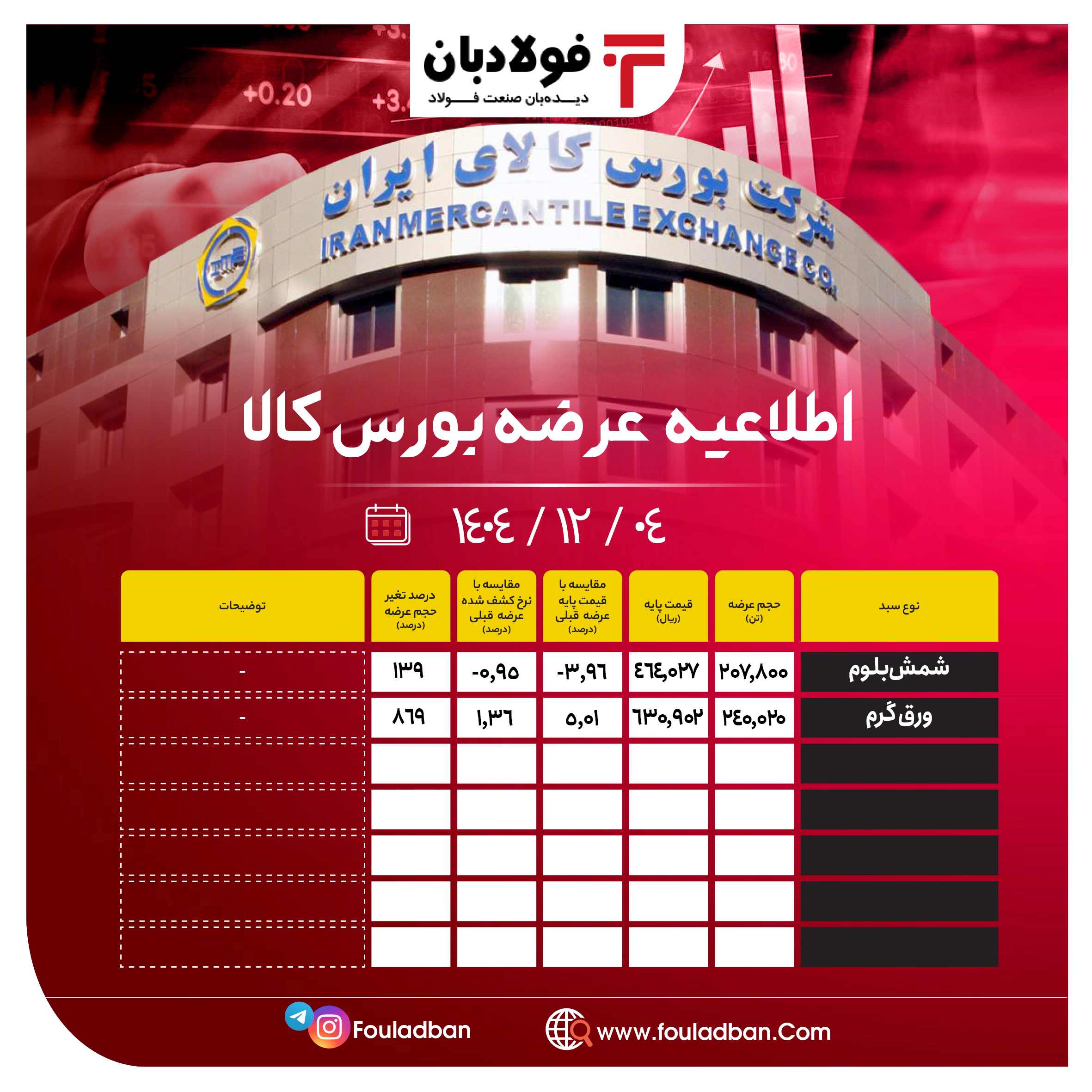 براساس اطلاعیه بورس کالا روز دوشنبه (4 اسفند ۱۴۰۴) شاهد عرضه 2 محصول فولادی هستیم.