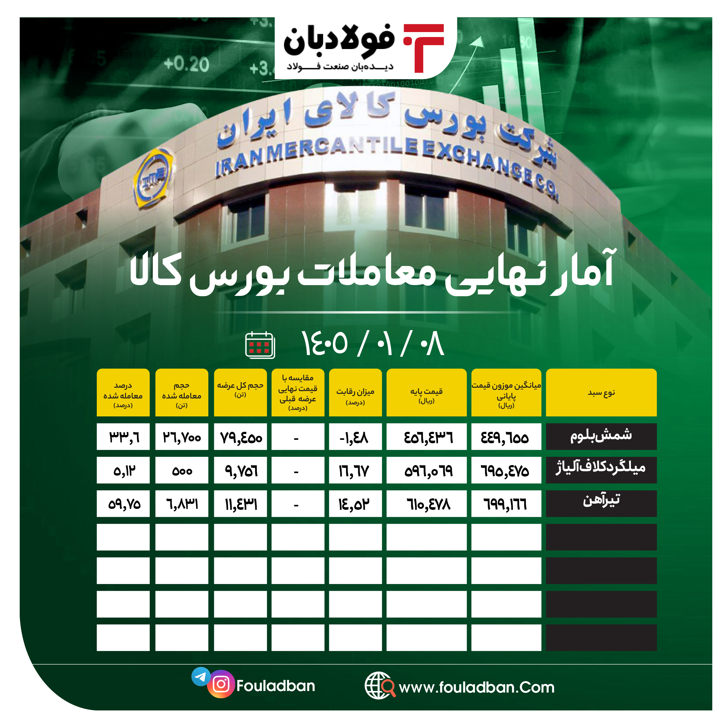 در این روز، ۷۹ هزار و ۴۵۰ تن شمش بلوم عرضه شد که ۲۶ هزار و ۷۰۰ تن از آن، معادل ۳۳٫۶ درصد، به فروش رسید. قیمت میانگین موزون ثبت‌شده برای این محصول ۴۴۹ هزار و ۶۵۵ ریال بود.