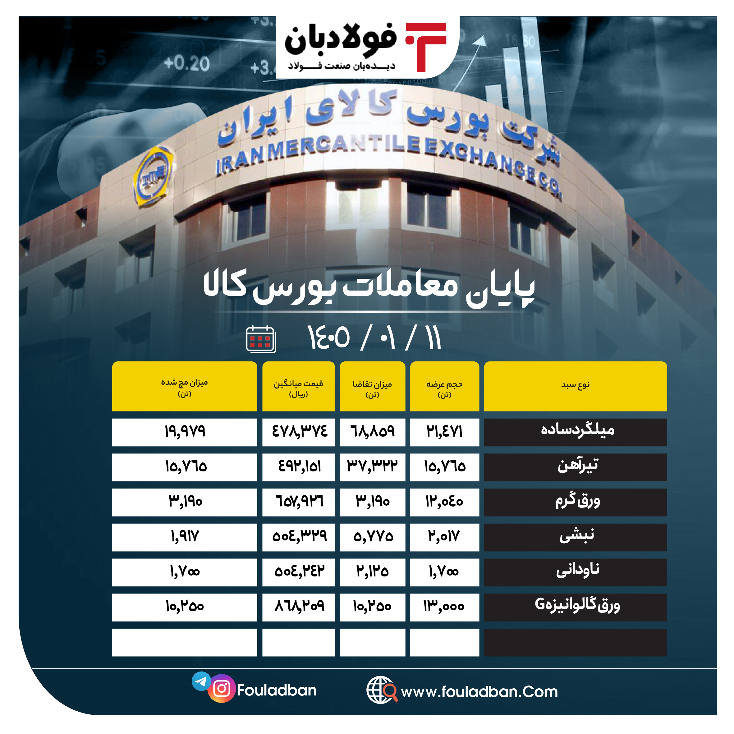 در معاملات امروز سهشنبه ۱۱ فروردین ۱۴۰۵، ۶۵ هزار و ۹۹۳ تن محصول فولادی وارد تابلوی معاملات بورس کالا شدند.